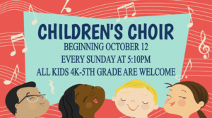 Does your child love to sing? Have them come to our Children’s Choir beginning September 14th at 5:10 PM. This is for children in 1st – 5th grade currently, Preschoolers (4k) may join beginning October 12th.