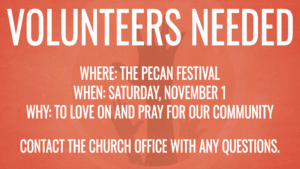 Pecan FestivalThis year we have been blessed with the opportunity to have a table at the annual Pecan Festival. We are planning on having Crafts for Kids, “Ask A Pastor”, and to have people from our church pray with and love on our community. This event is on Saturday, November 1st and lasts from 10am-7pm. We are asking for volunteers to help fill in throughout the day. If you are feeling called to help out , please register below. This is an AMAZING opportunity for Florence to get to know Southside Baptist Church. Together, we can spread the gospel!