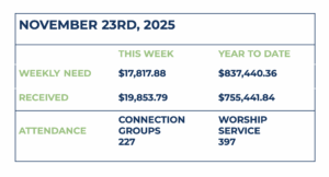 If you would like to learn more about the financial vision of our church for 2026, please join us on November 23rd, at 3:30pm, in the Worship Center. This is open to all church members and guests. You can pick up a copy of the proposed budget at the info desk or click below to see it.