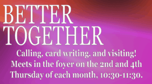 Join us in the foyer every 2nd and 4th Thursday of each month. We get together to write cards, call people, and go visiting. Please reach out to the office if you have any questions.