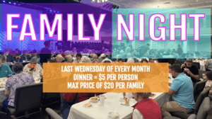 Family NightThe last Wednesday of each month is our Family Night. This is an amazing night of food, laughter, and fellowship. We sit down as a “family” and enjoy a meal together. This event is $5 per person with a maximum cost of $20 per family.