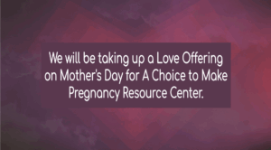 We will be taking up a love offering for A Choice to Make on Mother’s Day. This amazing organization empowers women and men in unplanned pregnancies to make life-affirming choices by speaking truth, showing respect, sharing the love of Christ, and giving support. Click below to learn more about A Choice to Make.