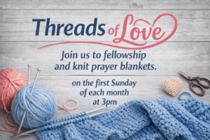 Meet in room F114 on the first Sunday of each month at 3:00pm, to get together and fellowship while knitting prayer blankets. These blankets are used for baptisms, graduates, child dedications, and people who need to be wrapped in love.